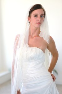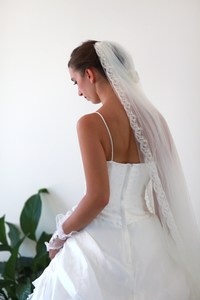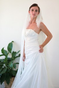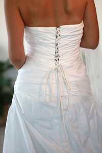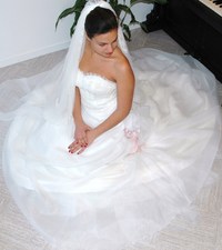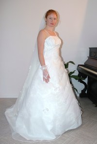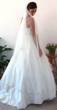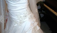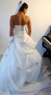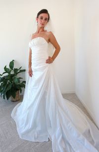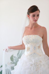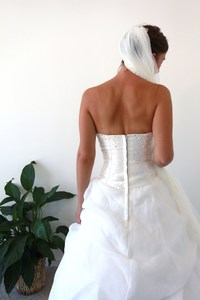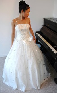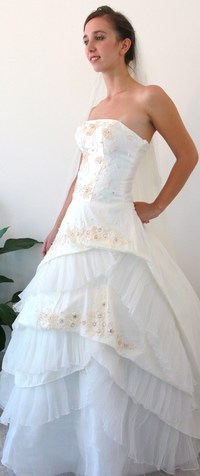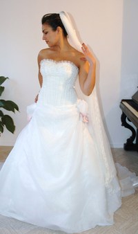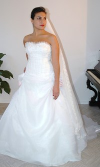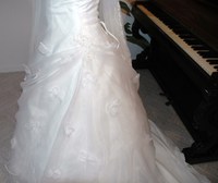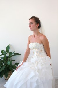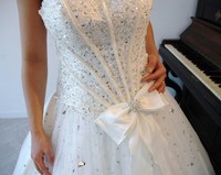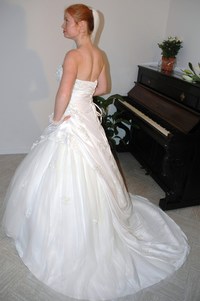 Somptueuse robe, surlignée par un bustier finement perlé. Sa jolie traîne est soulevée point par point par de petits nœuds en satin.