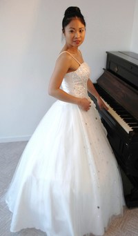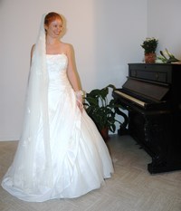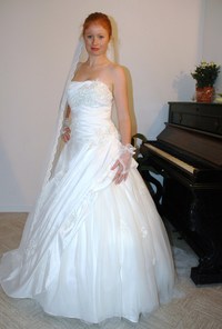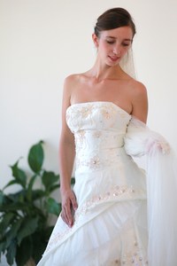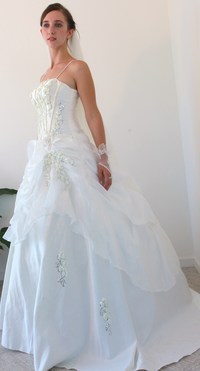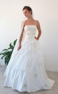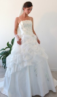 Une coupe traditionnelle avec des roses brodées, du strass et des broderies. La robe peut être portée avec ou sans bretelles. Fermeture éclair au dos.