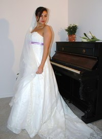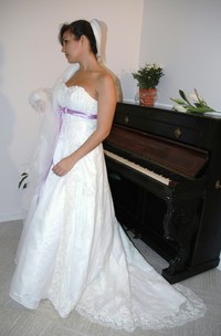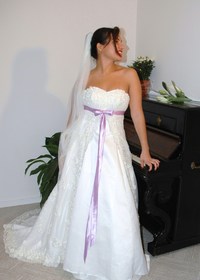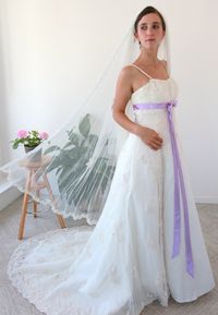 En dentelle fine subtilement perlée, cette robe est ornée d'un long ruban violet. Traîne chapelle.