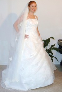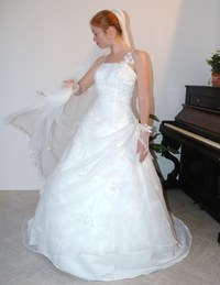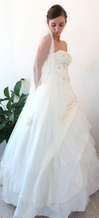 Très subtile robe de mariée en ligne A avec des fleurs de dentelle. La bretelle est ornée par de petites fleurs en perles. Cette décoration est harmonieusement rappelée sur une hanche.